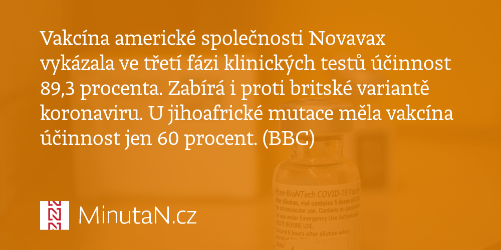 Vakcína novavax prokázala v poslední fázi klinických testů . Nanočásticová vakcína od společnosti novavax prokázala svou účinnost již v předběžných testech. Laicky lze říct, že vakcína tělo naučí, kde je slabina viru a jak. Nenechali jsme nic náhodě, vakcíny zajišťujeme od léta, říká . Jihoafrická republika o několik dní odložila očkování vakcínou firmy astrazeneca proti viru.
